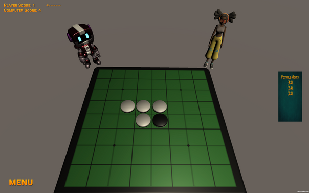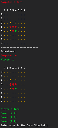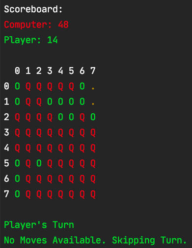 Terminal game for playing Reversi against an AI that uses MiniMax algorithm with alpha/beta pruning to handle game theory.